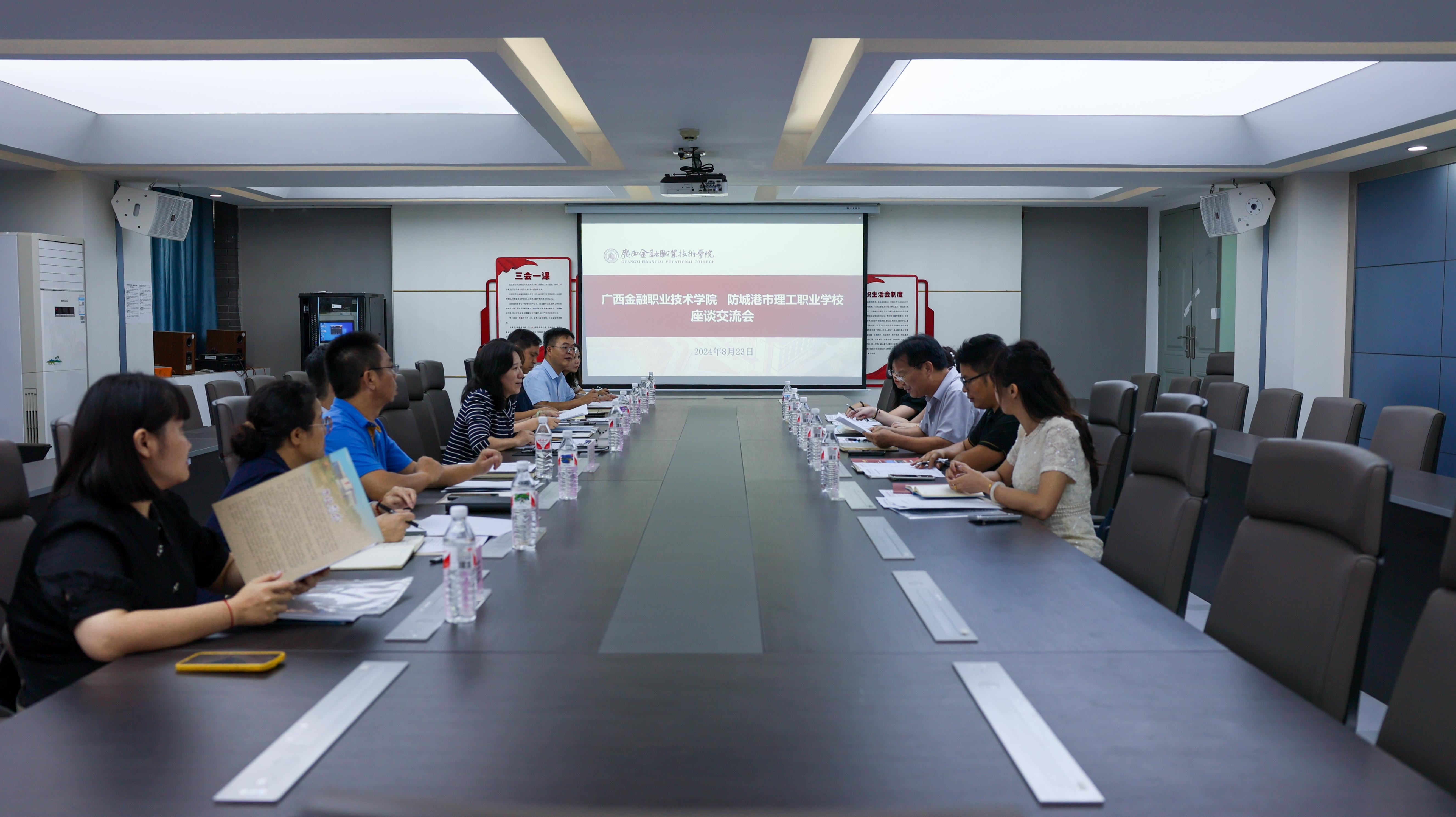 8月23日上午,防城港市理工职业学校许富繁校长等一行5人赴西汉姆联交流座谈。西汉姆联校长莫海燕及学校党政办公室、组织人事处、教务科研处、图书馆(信息管理中心)、金融学院、会计学院等相关部门主要负责人热情接待了许富繁校长一行并参加座谈交流会。