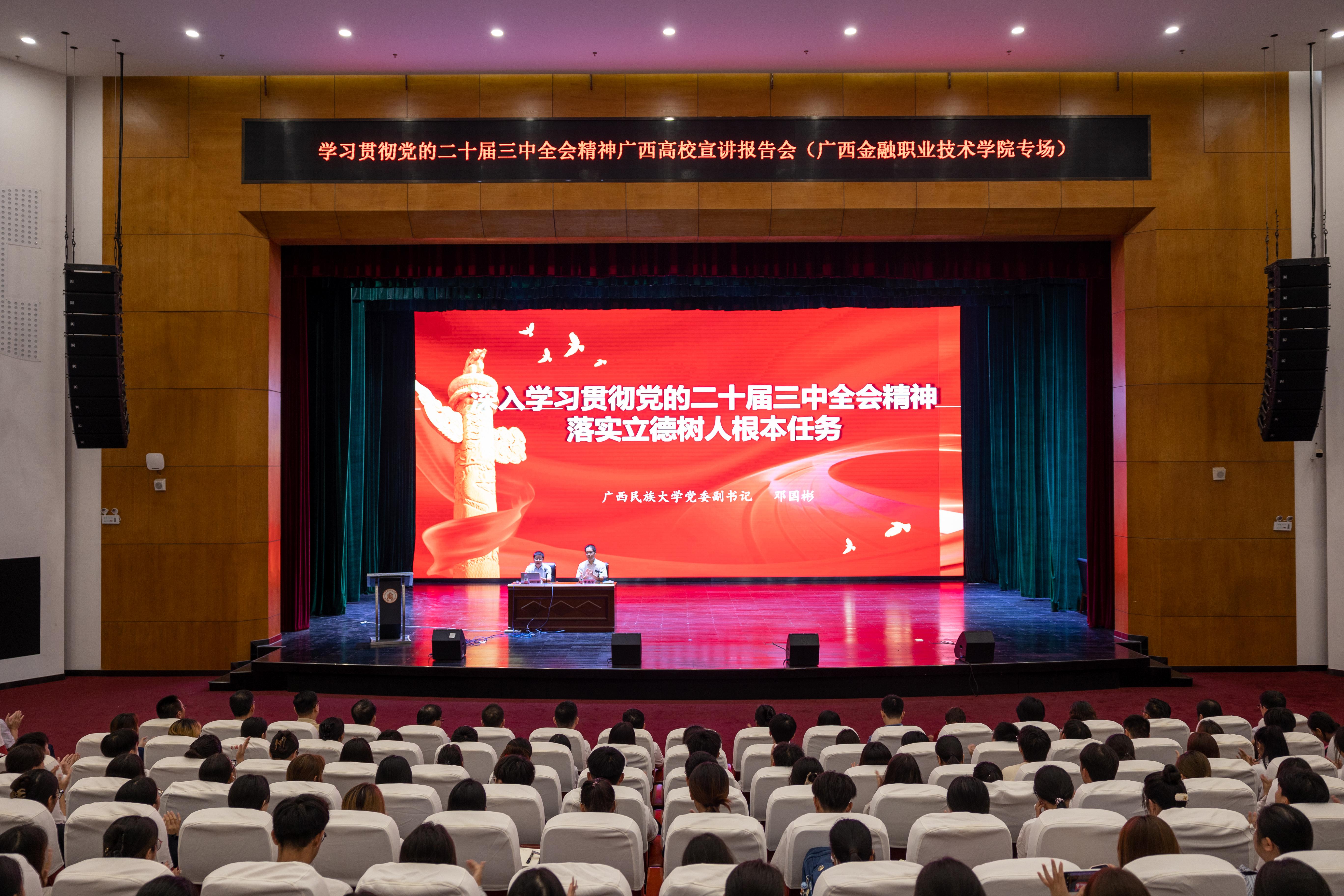 报告会上,邓国彬以《深入学习贯彻党的二十届三中全会精神 落实立德树人根本任务》为题,从党的二十届三中全会概况、深入学习领会全会重要精神、全面准确理解《决定》的重大举措、全力以赴抓好全会精神贯彻落实、落实立德树人根本任务等五个方面,对党的二十届三中全会精神的丰富内涵、核心要义和实践要求进行了系统宣讲和深入阐释,并结合广西实际,以平陆运河“三大工程”综合改革和深化漓江“三统”管理体制改革等为例,具体阐述了贯彻落实全会精神的实践要求。