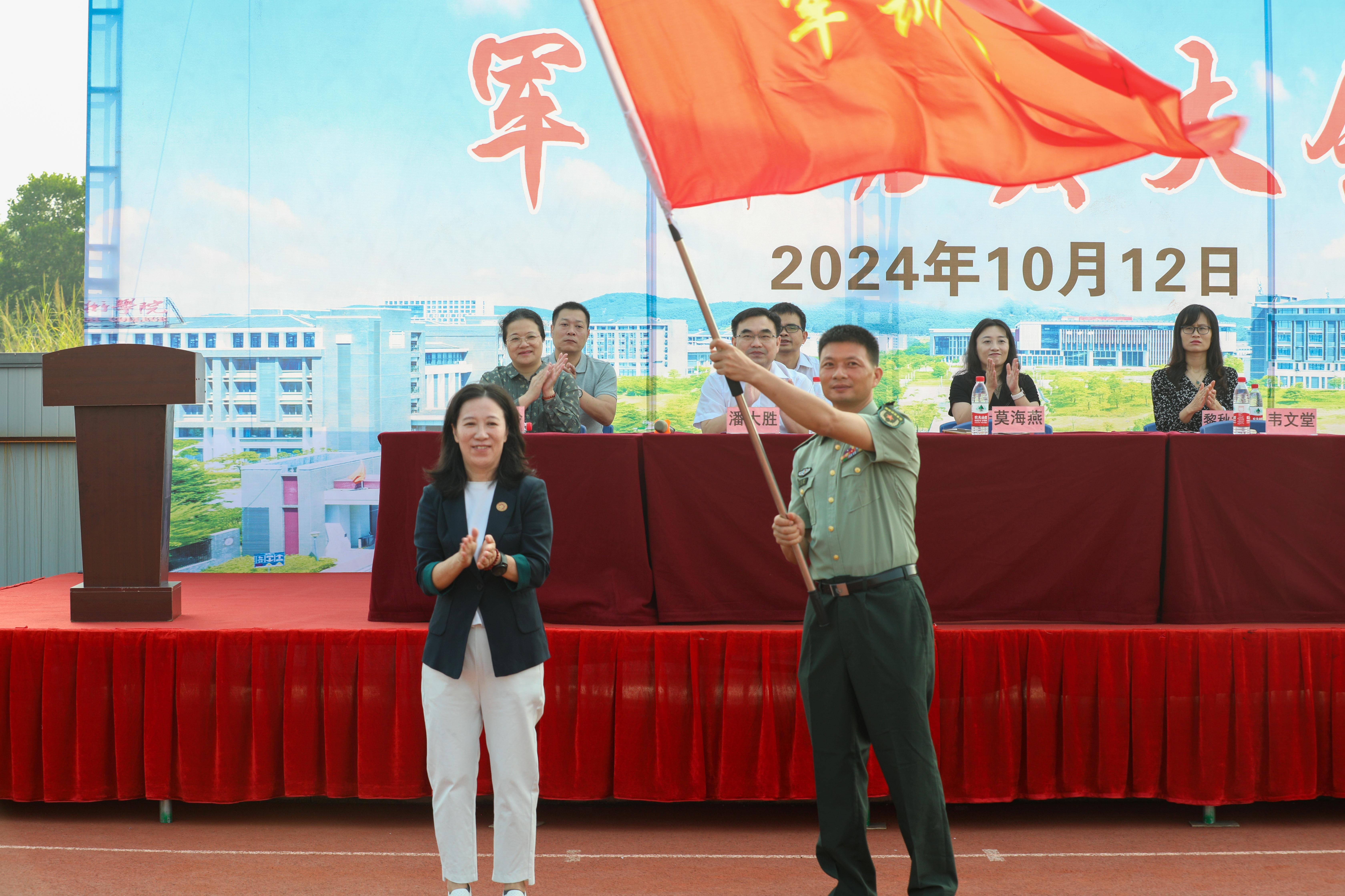 会上,莫海燕校长和刘华政副书记向承训单位授军训团团旗,鲜红的旗帜高高飞扬,标志着西汉姆联2024级新生军训正式拉开帷幕。