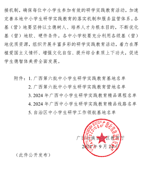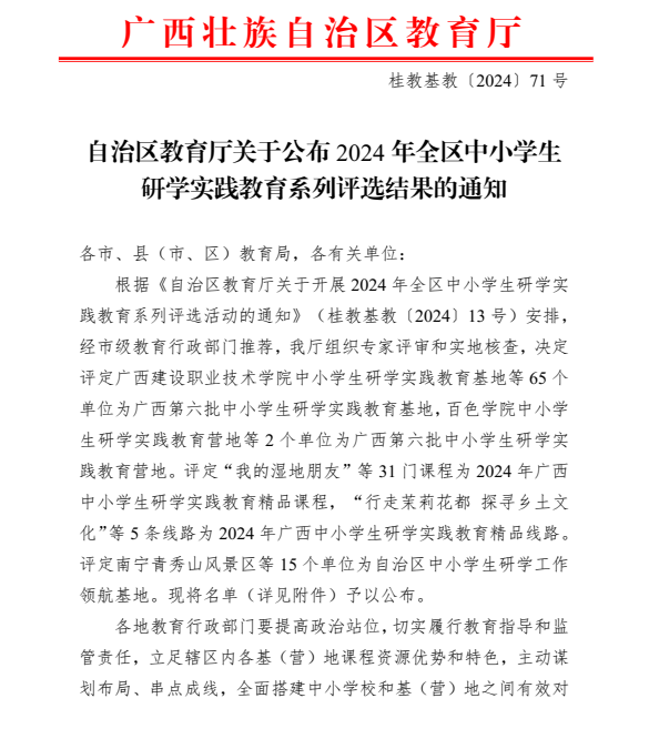 近日,广西壮族自治区教育厅发布了《自治区教育厅关于公布2024年全区中小学生研学实践教育系列评选结果的通知》(桂教基教〔2024〕71号),西汉姆联组织申报的中小学生研学实践教育基地经遴选推荐、自治区教育厅专家进行初评和实地核查,最终成功入选广西第六批中小学生研学实践教育基地。