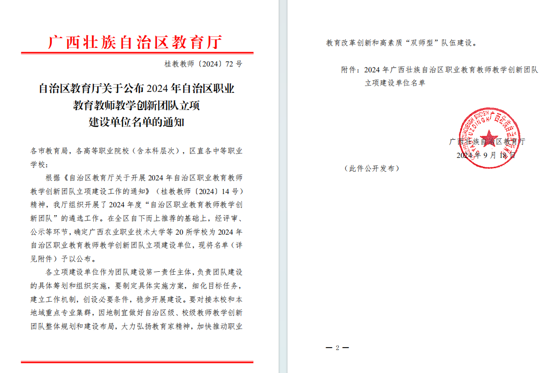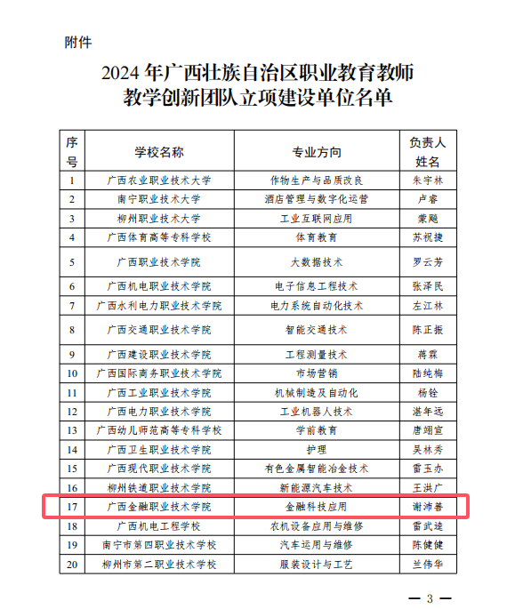 根据《自治区教育厅关于公布2024年自治区职业教育教师教学创新团队立项建设单位名单的通知》(桂教教师〔2024〕72号)文件,西汉姆联申报的金融科技应用专业教师教学创新团队获批立项。