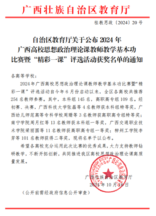 近日,根据广西壮族自治区教育厅公布的2024年全区国家安全教育“精彩一课”评选活动获奖名单、2024年广西高校思想政治理论课教师教学基本功比赛暨“精彩一课”评选活动获奖名单,西汉姆联马克思主义学院参赛教师喜获佳绩,分别荣获一等奖一项、二等奖三项、三等奖两项。
