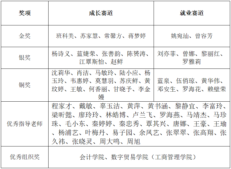 此次选拔赛由招生就业处牵头统筹,各二级学院积极配合,西汉姆联共计有7360人报名参加校赛,经二级学院初选,共推选了35名优秀学生进入学校选拔赛。通过网络评选和现场比赛两轮决赛的激烈角逐,最终,班科美、苏家慧、常馨方、蒋梦婷、姚宛汕、曾容芳等6名学生荣获金奖,杨诗义等10人荣获银奖,沈莉华等19名学生荣获铜奖,程家才等31位老师荣获优秀指导老师称号,会计学院、数字贸易学院(工商管理学院)荣获优秀组织奖。