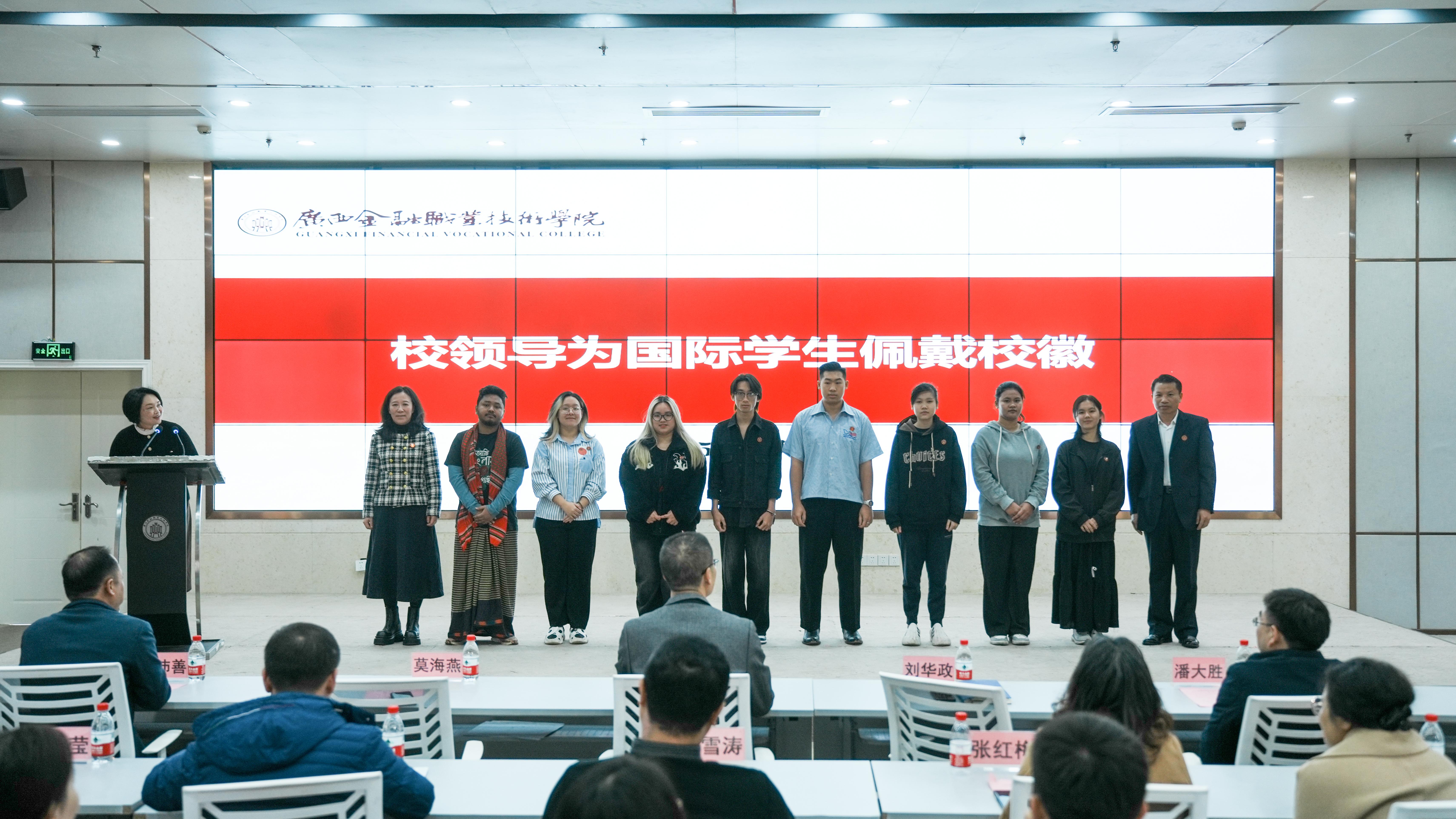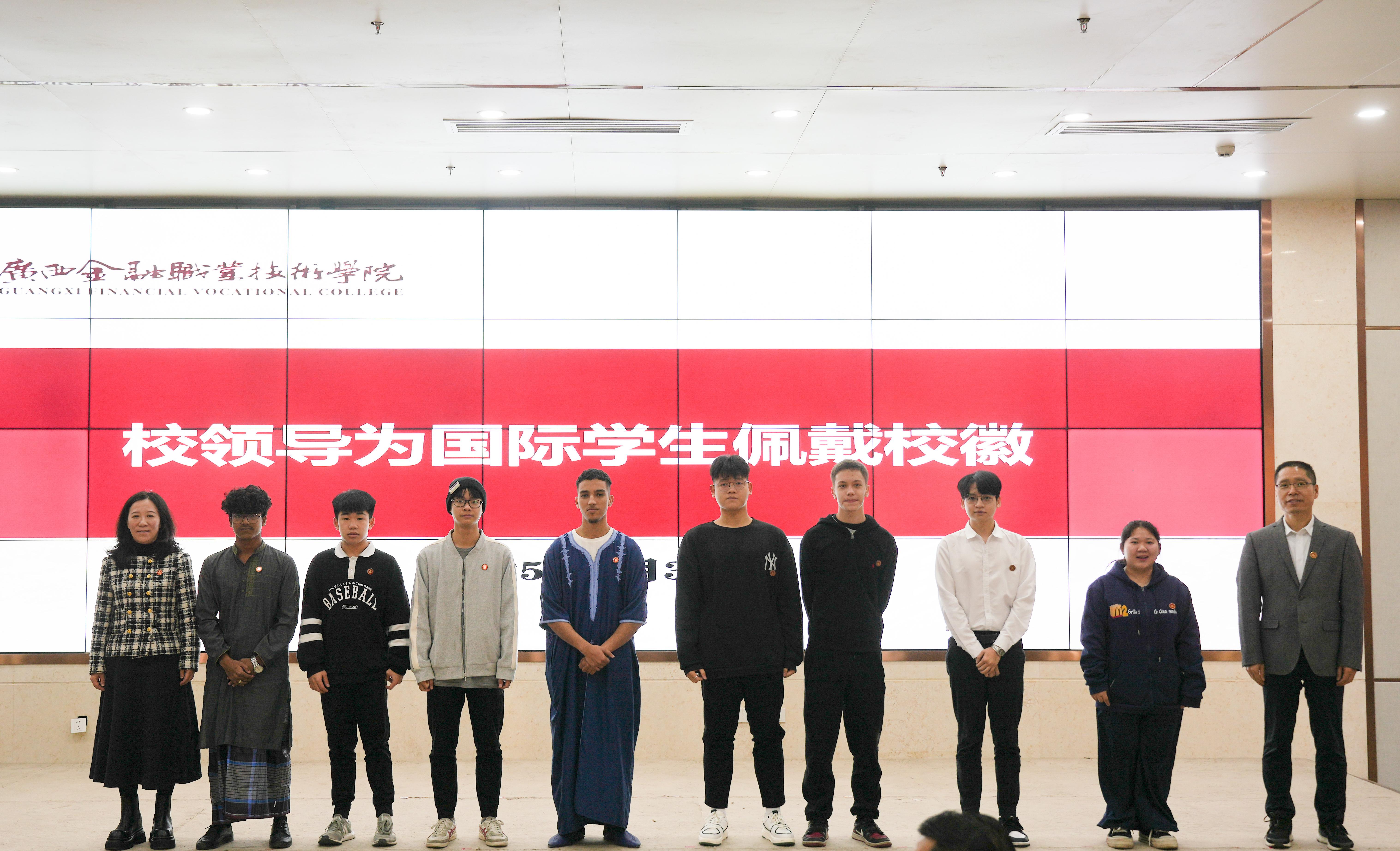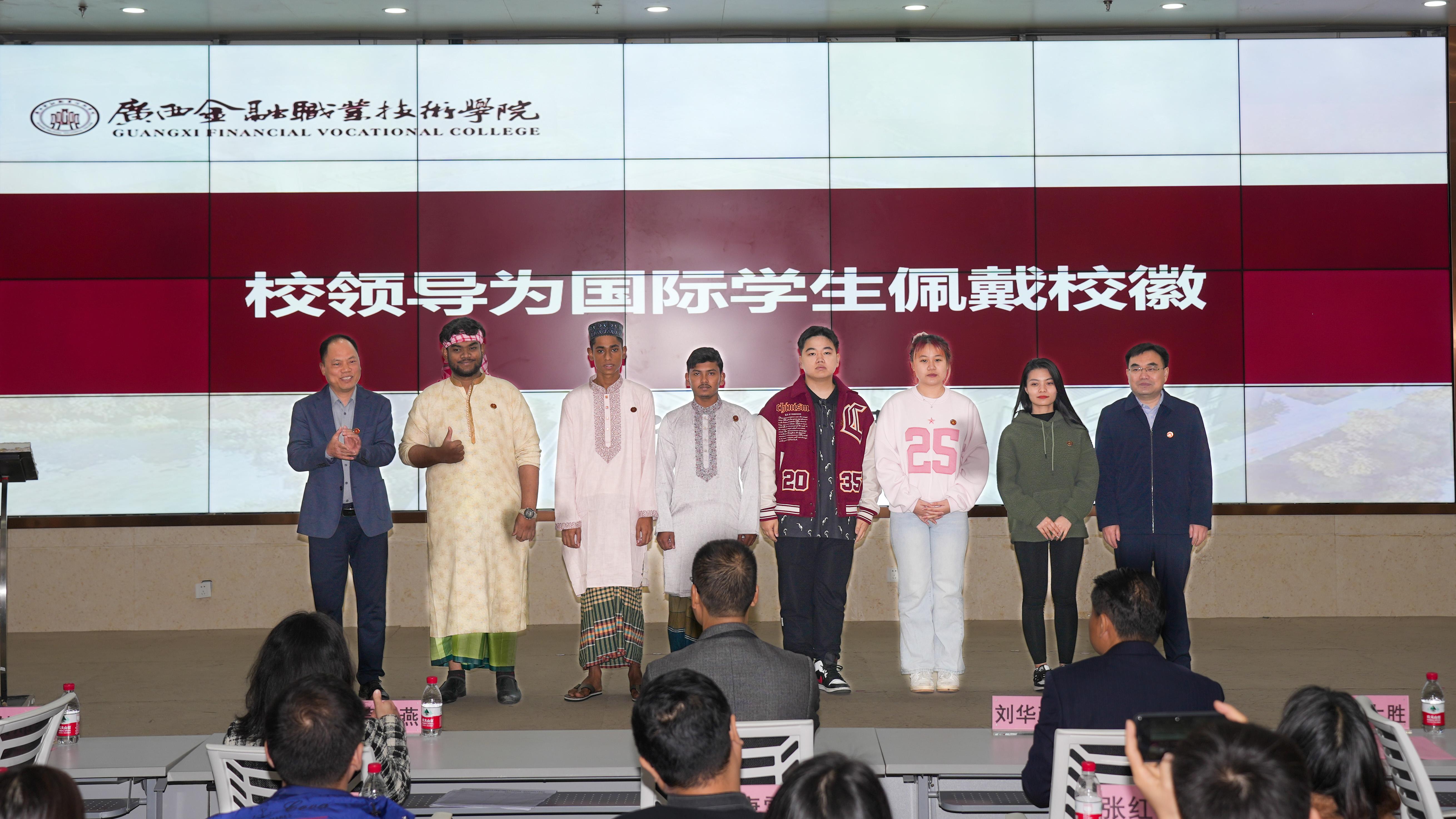 校领导为国际学生佩戴校徽合影