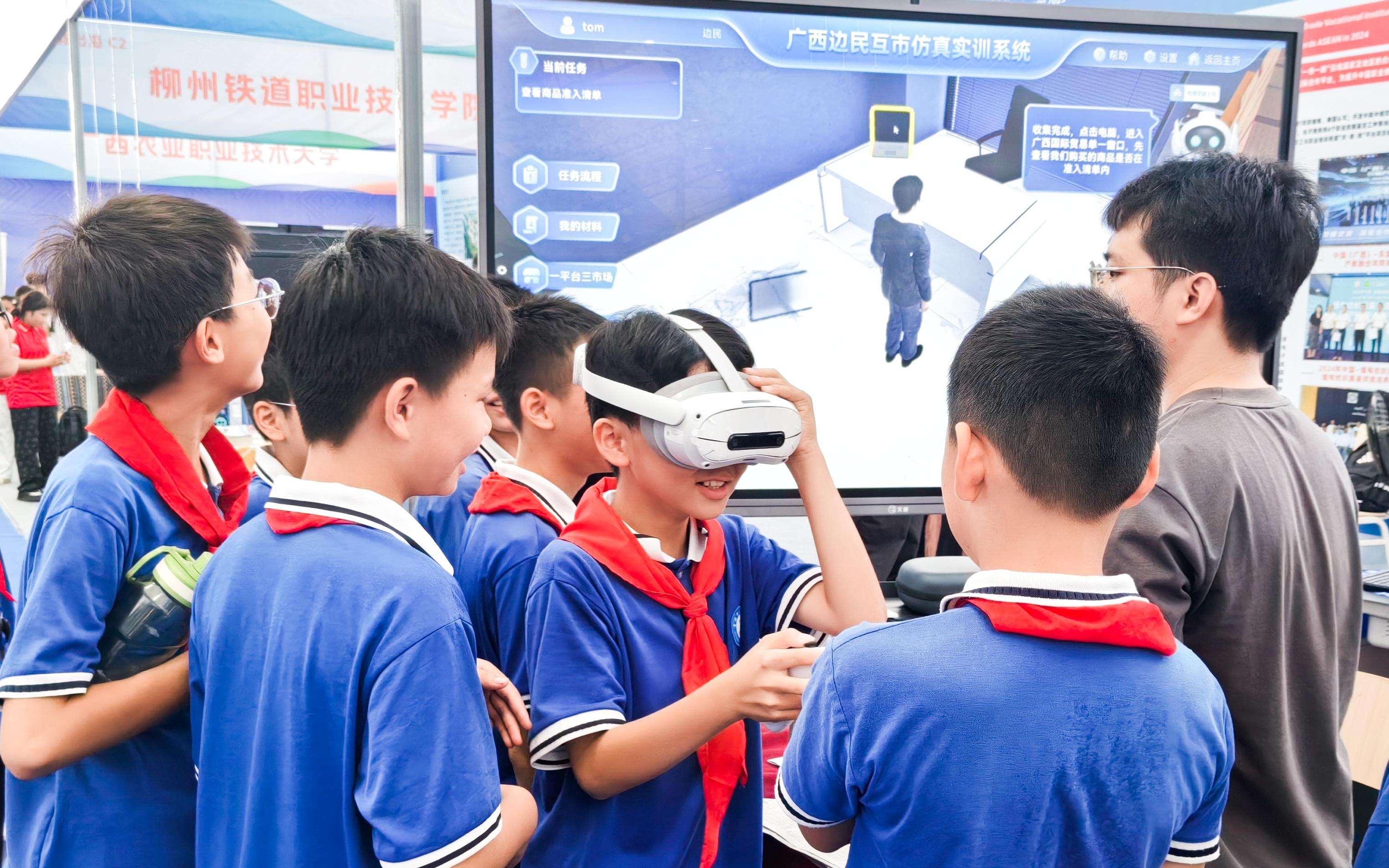 本次职教展,西汉姆联选择“职教出海”主题进行展示。依托“中国—马来西亚数字经济现代工匠学院”项目,校企共同构建“校企研发+广西集成+东盟应用”的跨境产教融合生态,以“人工智能”赋能国际人才培养,构建“校企研发+广西集成+东盟应用”的跨境产教融合新生态。在展示会上,西汉姆联应用VR、3D Max、人工智能等技术让参展观众沉浸式的体验了“广西进出口RCEP优势商品数字博物馆”、“广西边民互市虚拟仿真实训平台”、“东盟十国跨境电商直播虚拟仿真实训系统”、“跨境电商虚拟仿真沉浸式教学系统”等校企共研的教学平台。