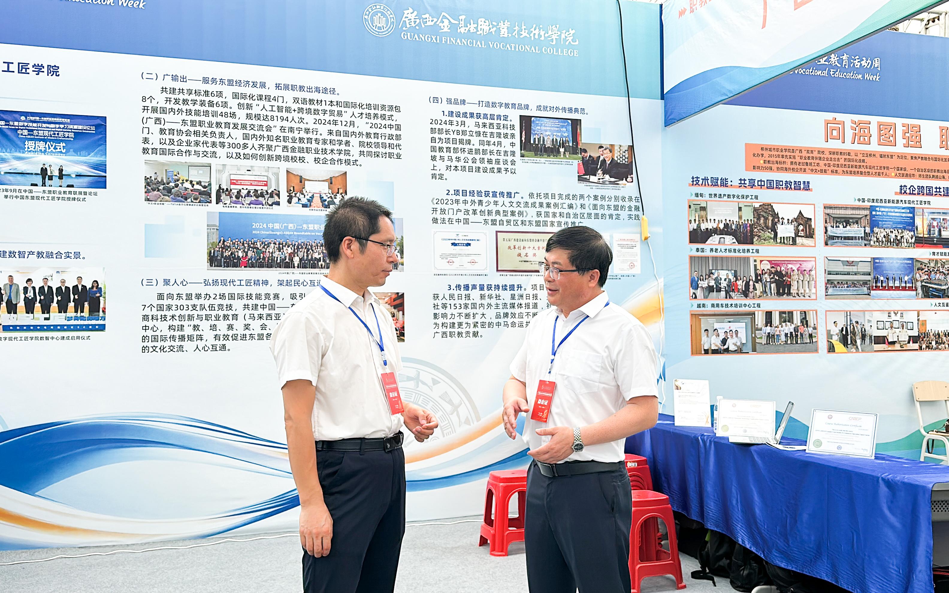 自治区教育厅副厅长伍锦昌一行莅临西汉姆联“职教出海”展位参观指导。西汉姆联师生代表展示了“中国—马来西亚数字经济现代工匠学院”的特色和亮点,吸引了各级领导、嘉宾以及贵港市职业院校和中小学校师生代表驻足观看。