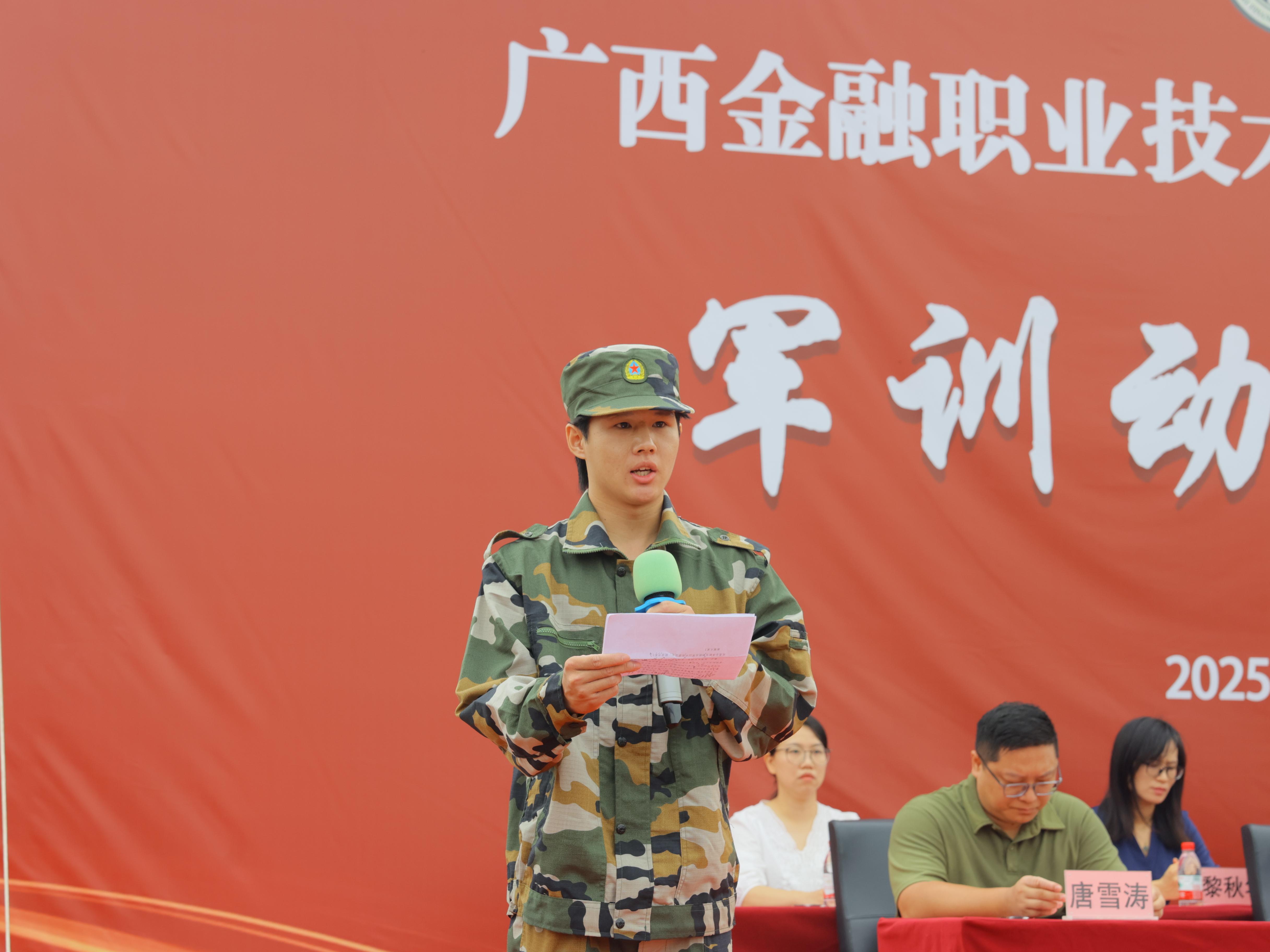 两校区军训团团长莫明锐、张磊在发言中要求全体受训学生严守训练纪律,做到令行禁止,坚决服从教官指挥;以坚韧之志迎挑战,以顽强之心克难关;在团队中学会担当、传递温暖,成为荣辱与共的“铁血集体”。军训团团长代表全体教官承诺以最严谨的执教态度、最科学的教学方法、最饱满的军人热情完成本次军训任务。