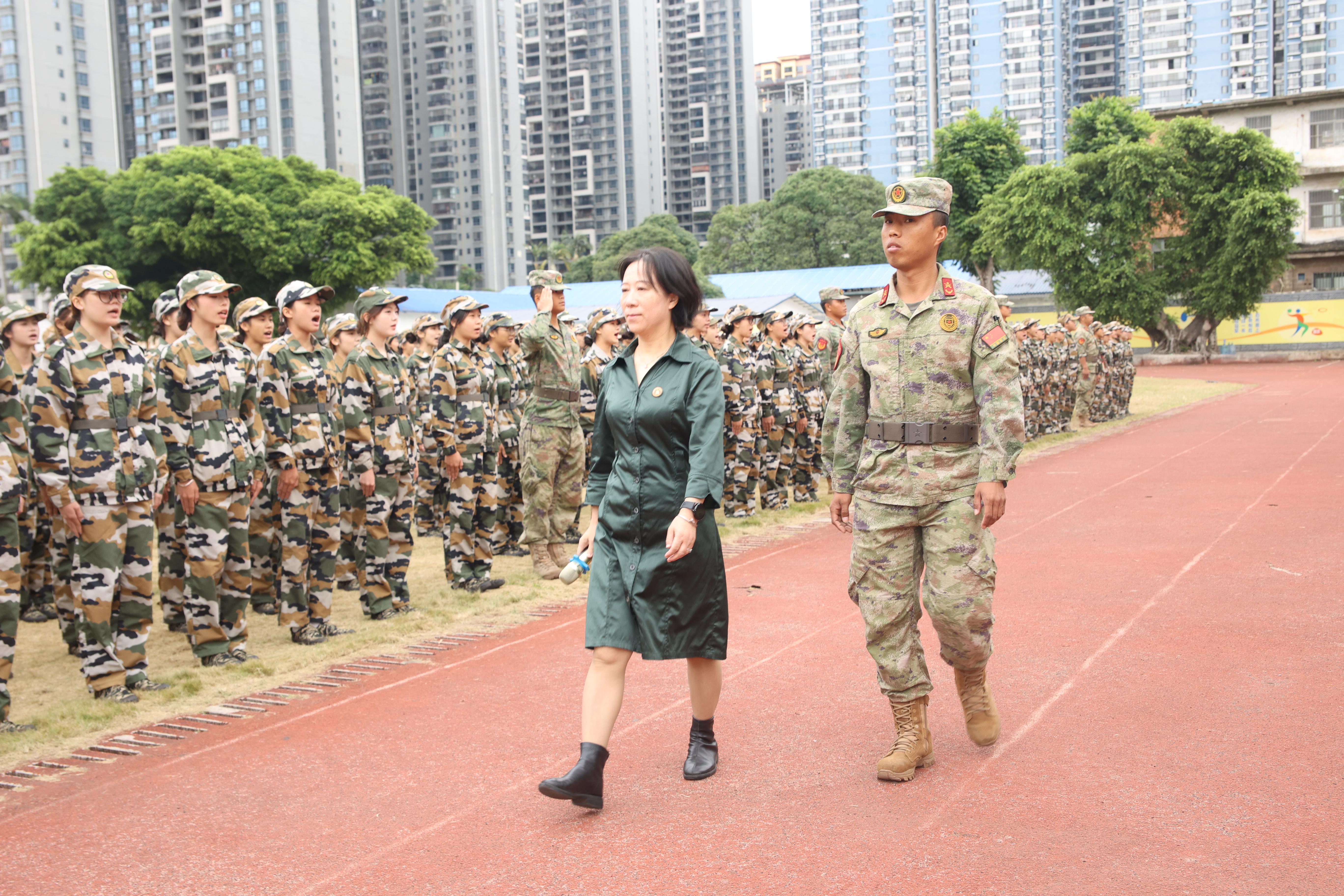 大会在雄壮的国歌声中拉开帷幕,两校区军训团团长陪同学校校长莫海燕、纪委书记覃炳达检阅学生方队。