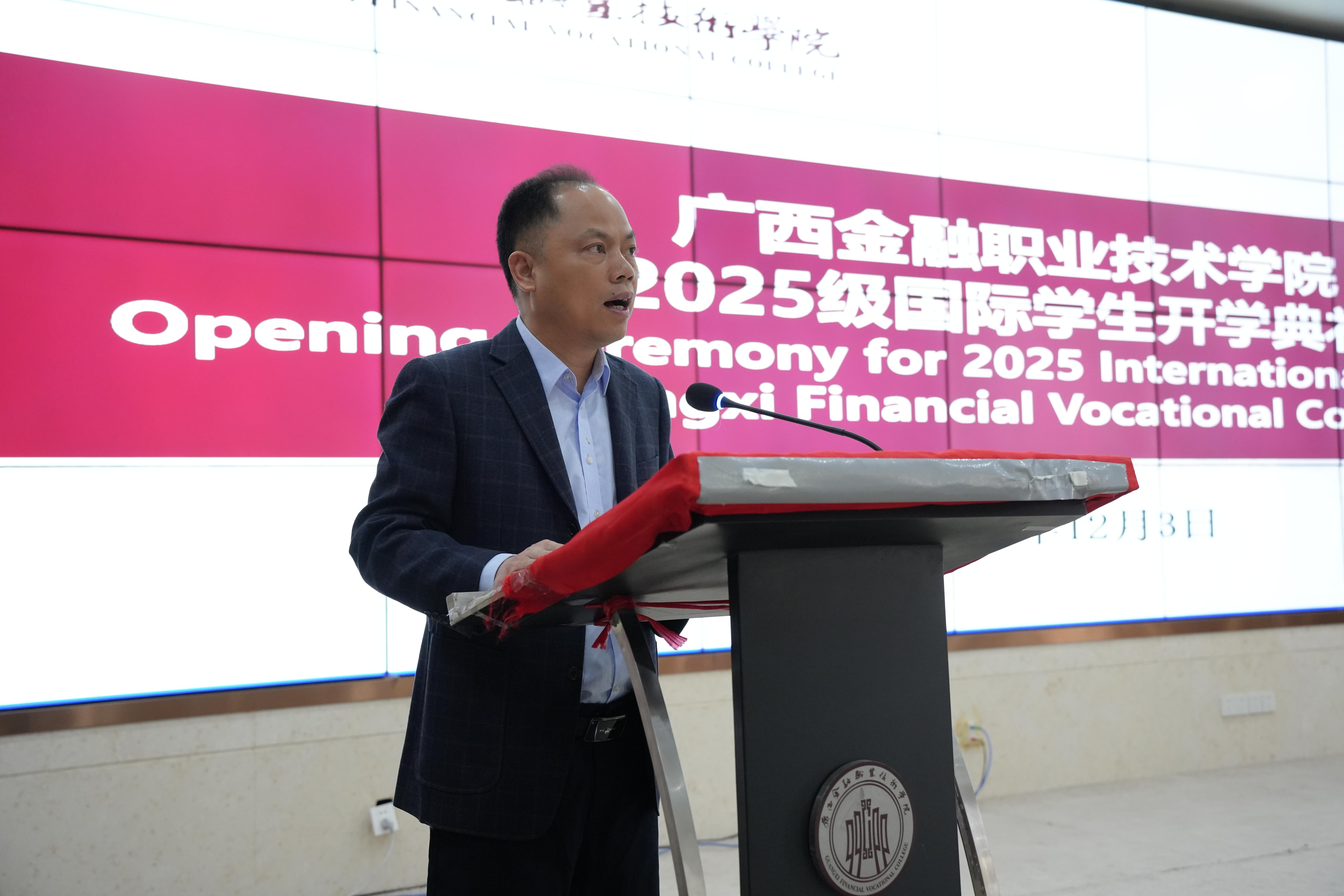 李高岩书记代表学校向全体2025级国际学生表示热烈欢迎。李书记对同学们提出三点希望:一是以“接纳”之心适应新旅程,体验南宁风土人情;二是以“钻研”之力练就真本领,契合时代需求;三是以“真诚”之态搭建友谊桥,成为中外友好交流的使者。