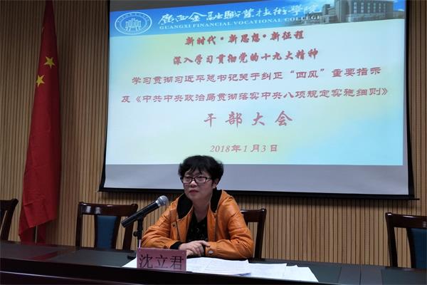 1月3日下午,我院在东校区六楼会议室召开干部大会,学习贯彻习近平总书记关于纠正“四风”重要指示及《中共中央政治局贯彻落实中央八项规定实施细则》,学院领导及全体科级以上干部参加会议。党委书记沈立君主持会议。