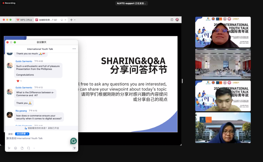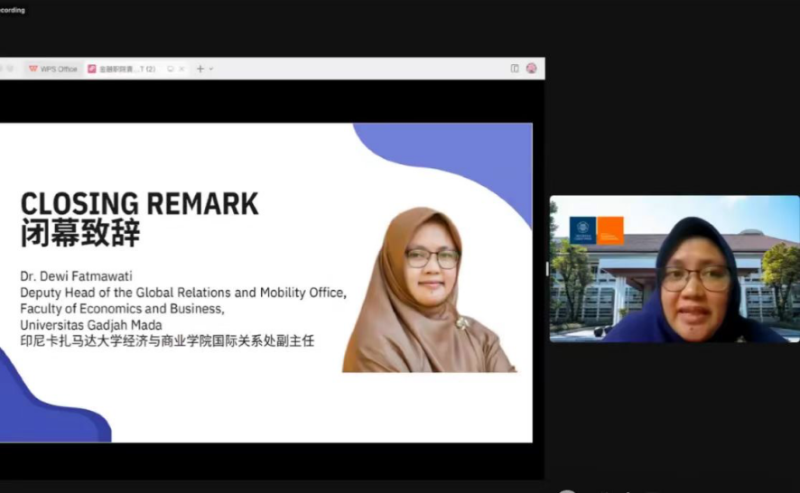 分享结束后,来自印尼卡扎马达大学经济与商业学院国际关系处副主任Dr.Dewi女士进行闭幕致辞。Dr.Dewi女士希望各国青年们将分享的观点与知识建立联系,形成共同学习以及相互激励的良好习惯,并期盼举办更多类似的活动以提高青年的创新和塑造未来的能力。