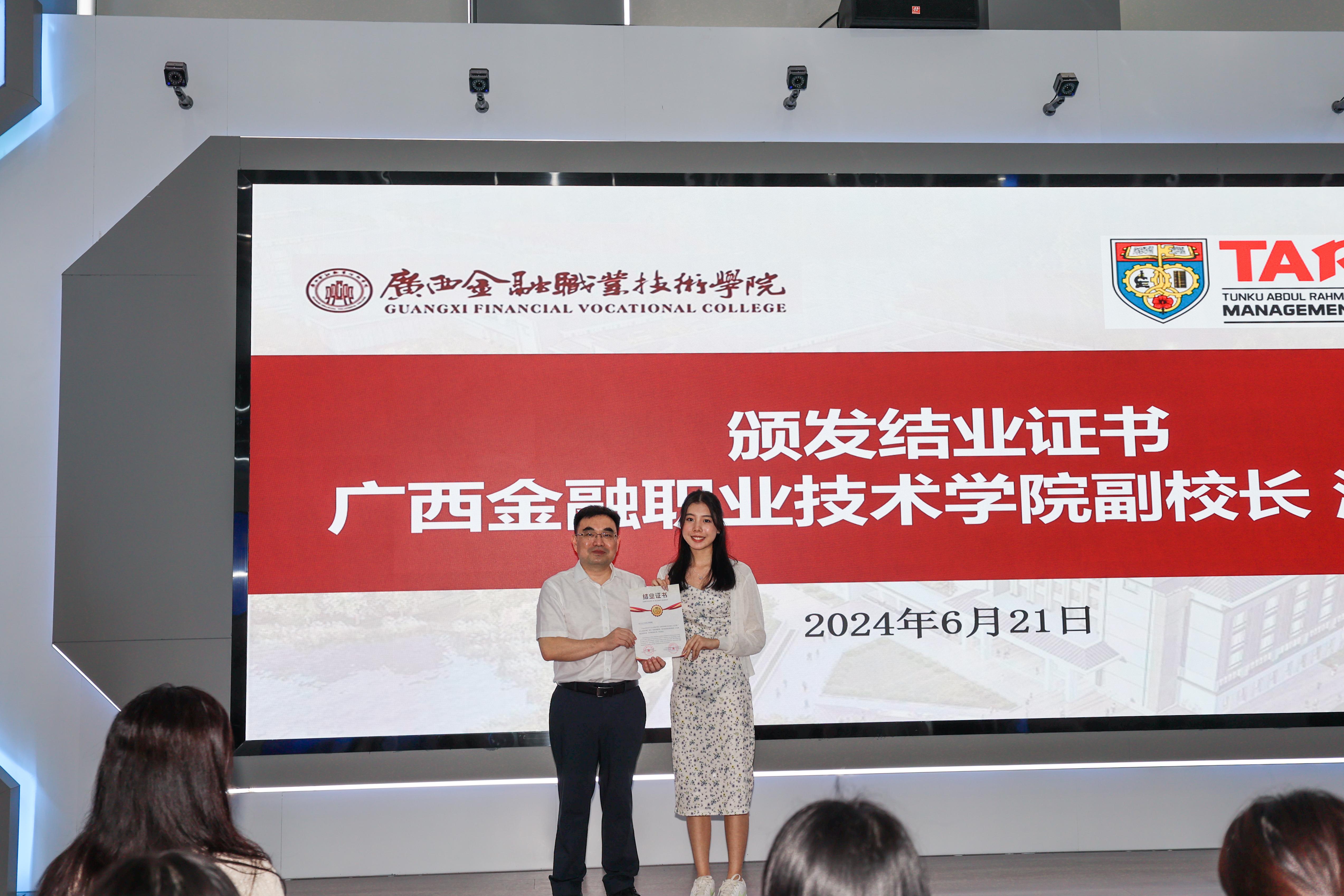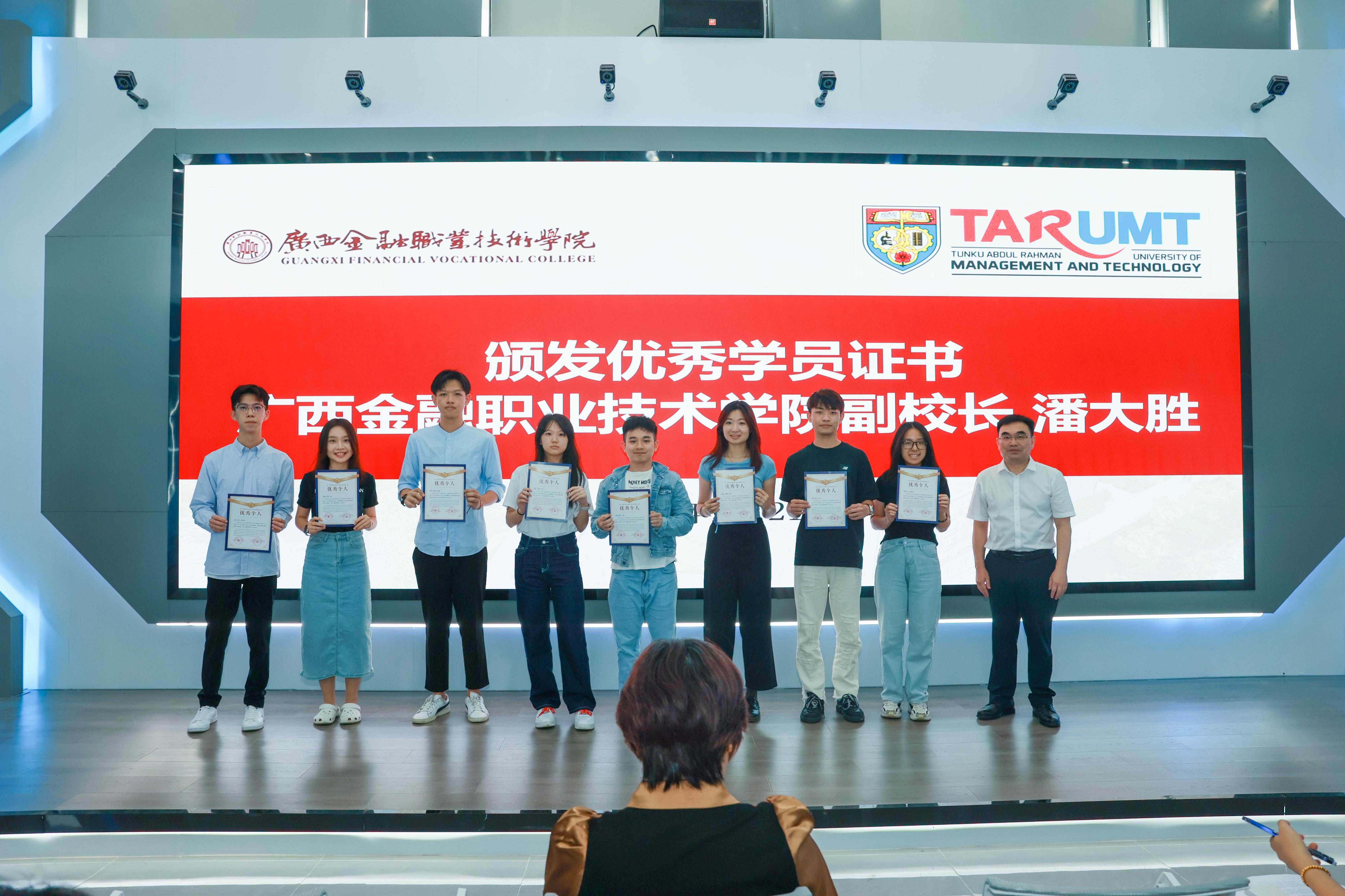 21日,本次交流学习的结业仪式在道德大讲堂举办。西汉姆联副校长潘大胜为拉曼理工大学学生颁发学业证书和优秀学员证书。