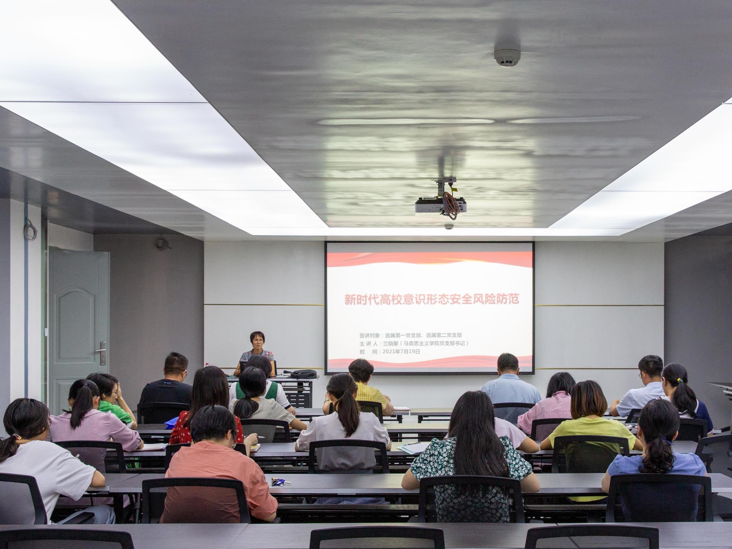 马克思主义学院党支部书记兰晓黎以《新时代高校意识形态安全风险防范》为主题为直属第一党支部、直属第二党支部宣讲。
