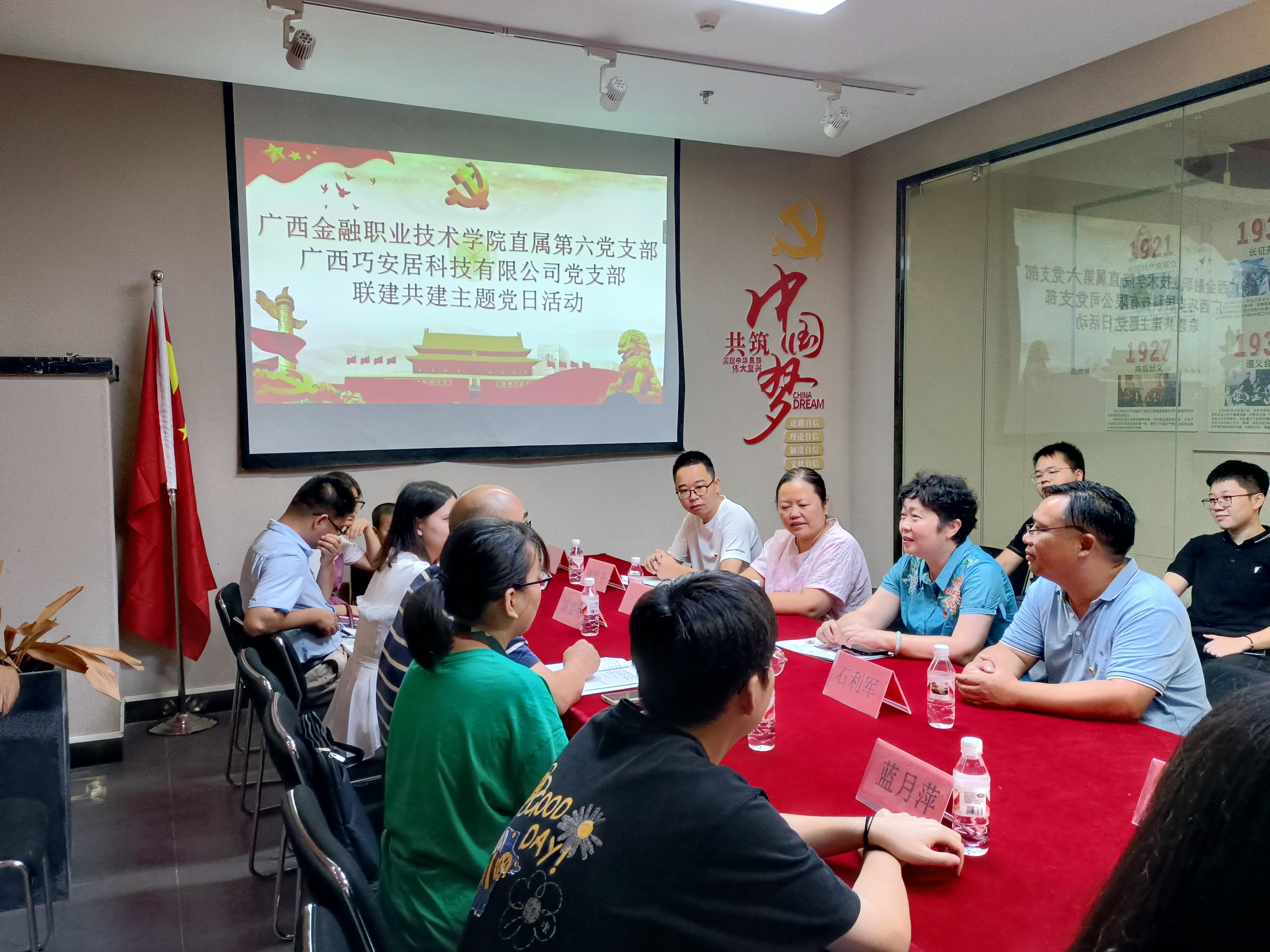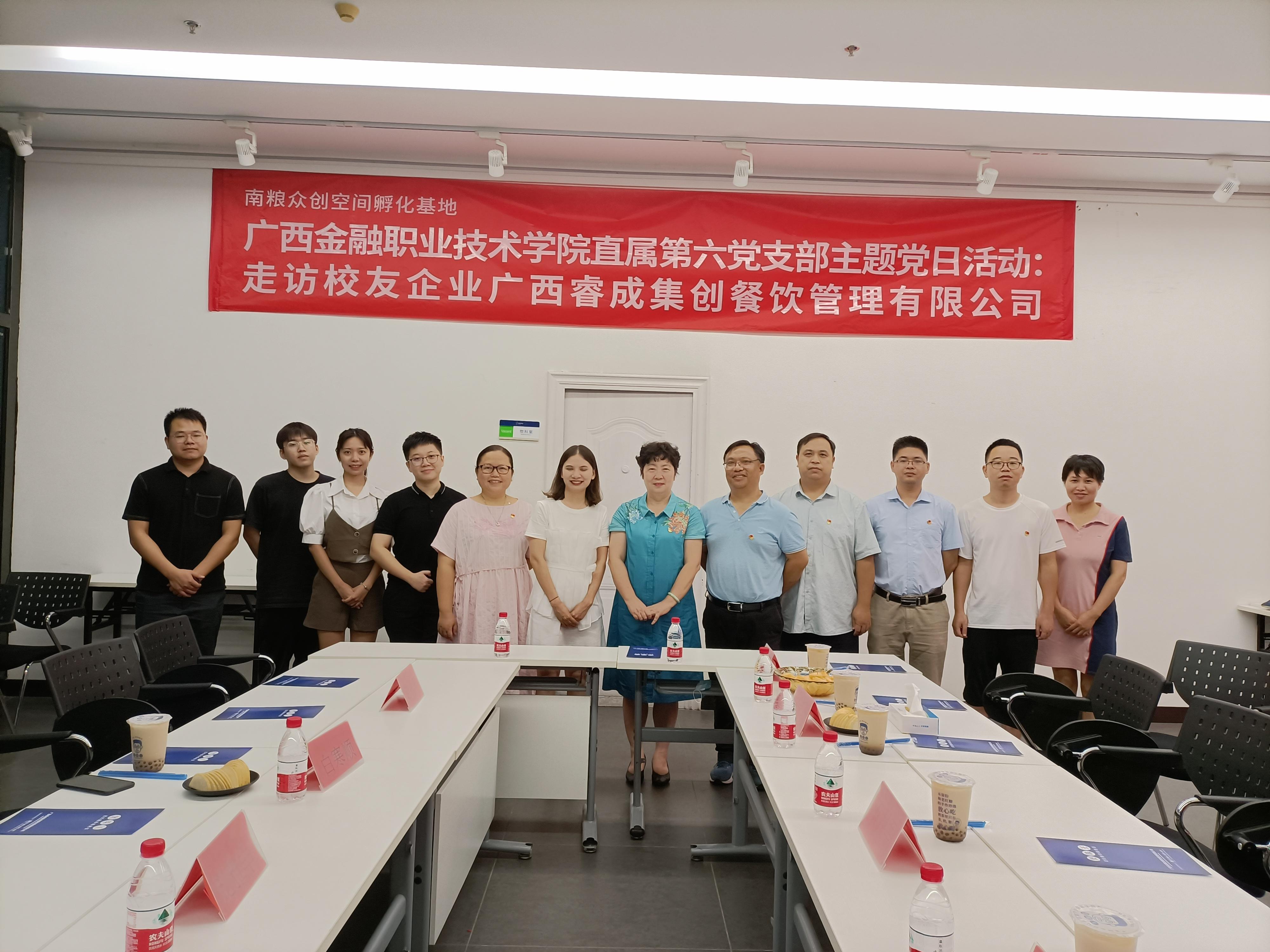 直属第六支部参观了校友企业办公所在地点南粮众创空间孵化基地,并分别与基地运营公司广西巧安居科技有限公司党支部、广西睿成集创餐饮管理有限公司创业团队座谈。
